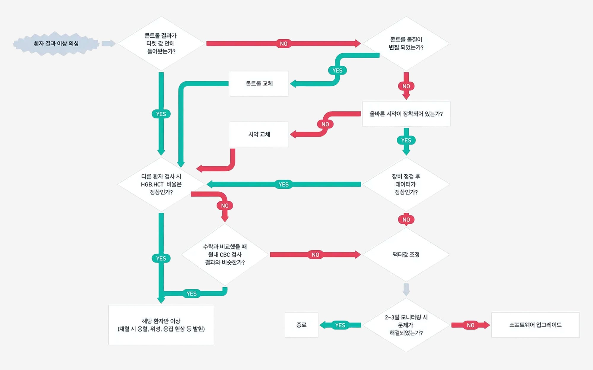 이 두 가지를 확인한 후에도 여전히 데이터가 맞지 않는다면, 장비의 점검이 필요해요. WBC/RBC Bath 세척, 밸브 점검 등 기본 장비 점검을 시행한 후에도 데이터에 문제가 있을 때, 팩터값 조정을 고려해 볼 수 있어요.