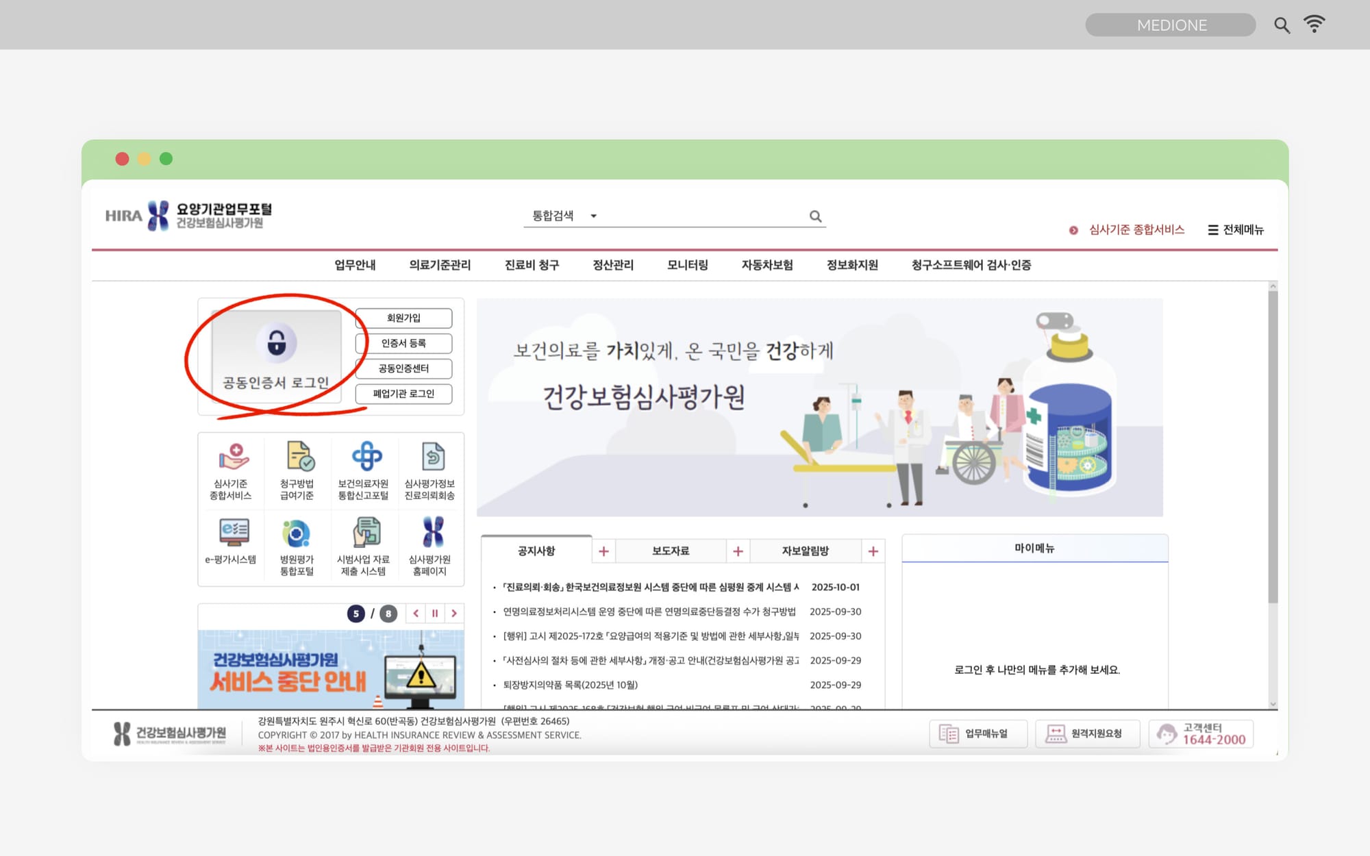- HIRA 요양기관업무포털 접속 후, 병원 공인인증서로 로그인해요.