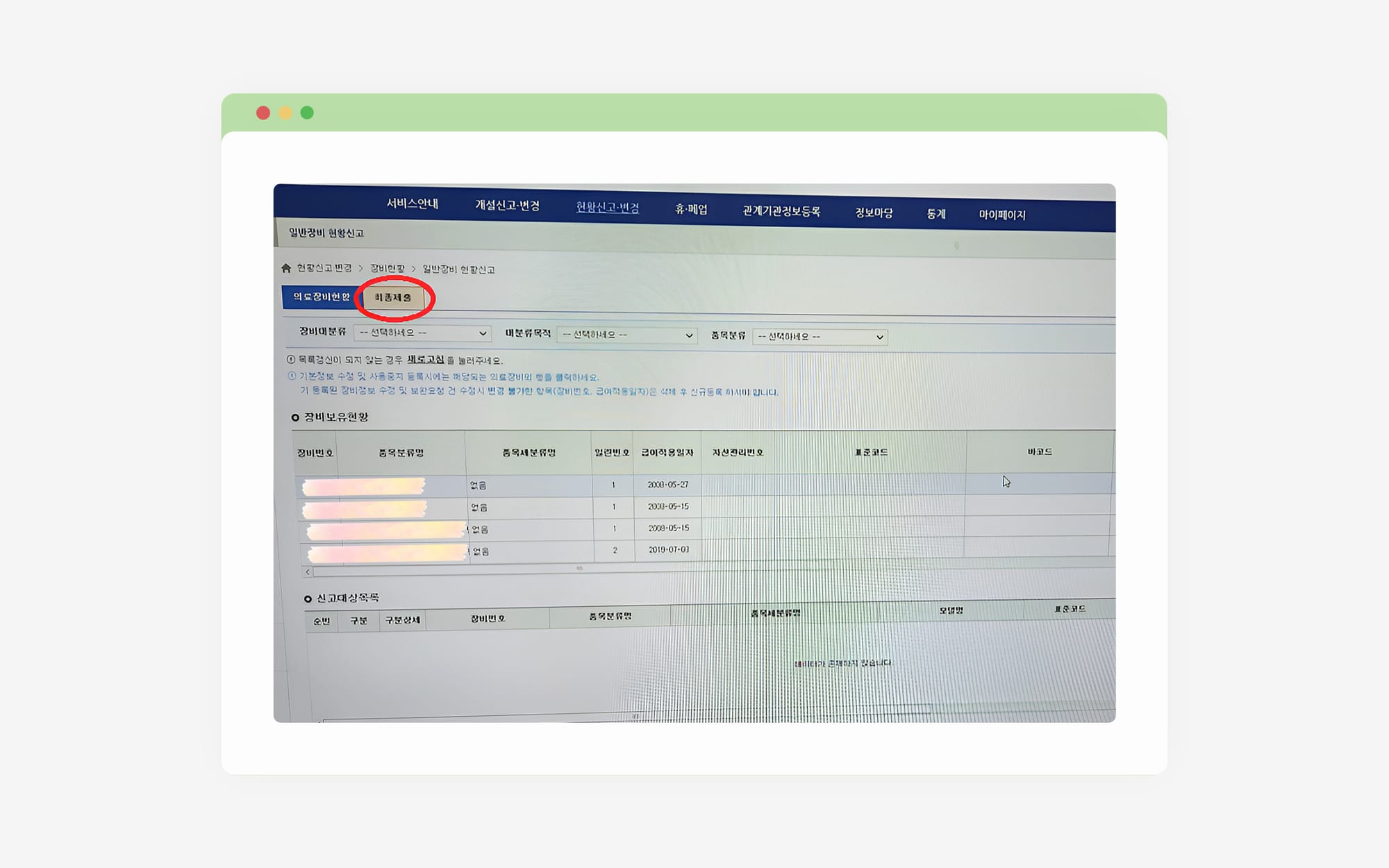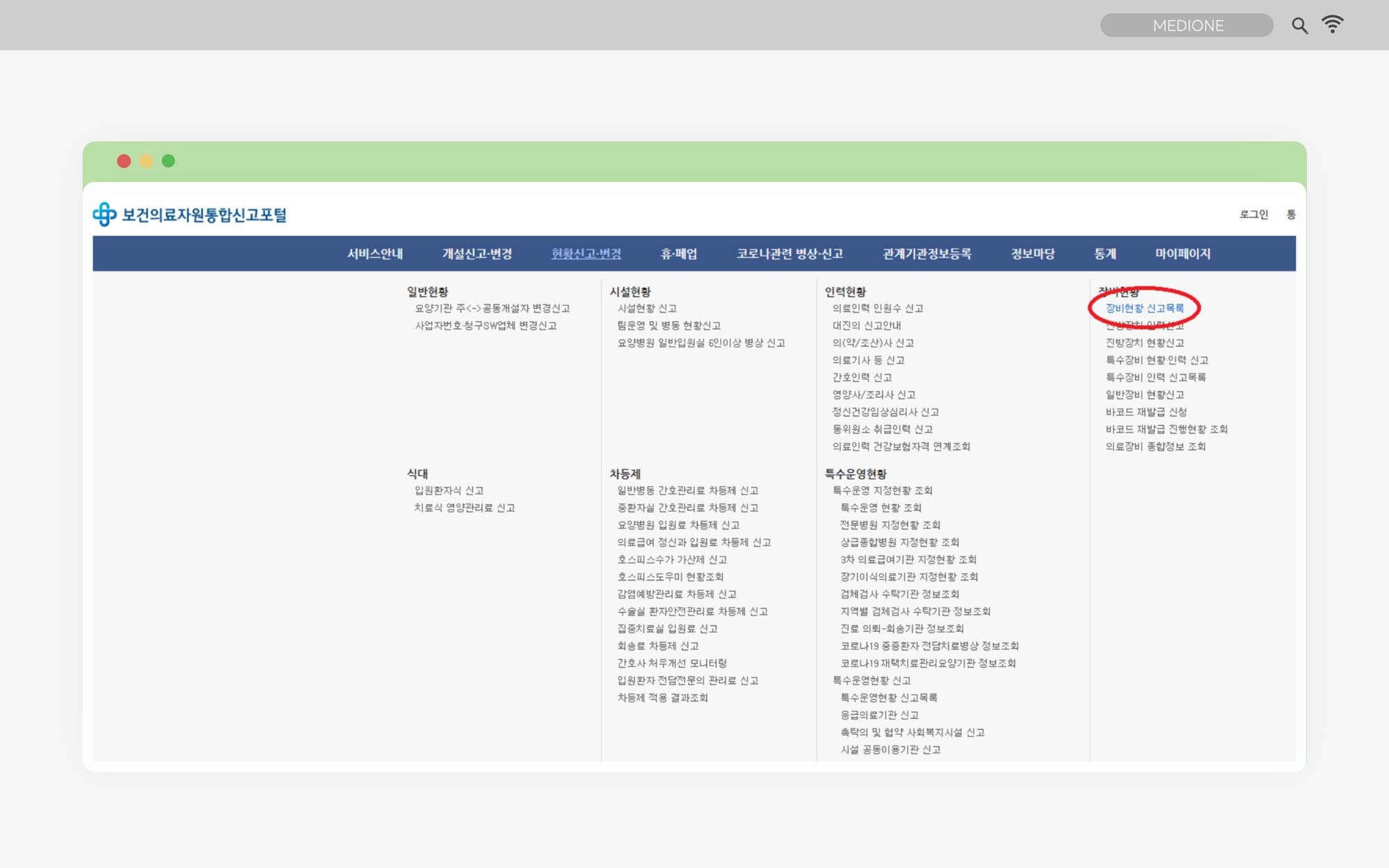 - [보건의료자원통합신고포털] → [현황신고/변경] → [장비현황 신고목록] 메뉴로 이동해요.