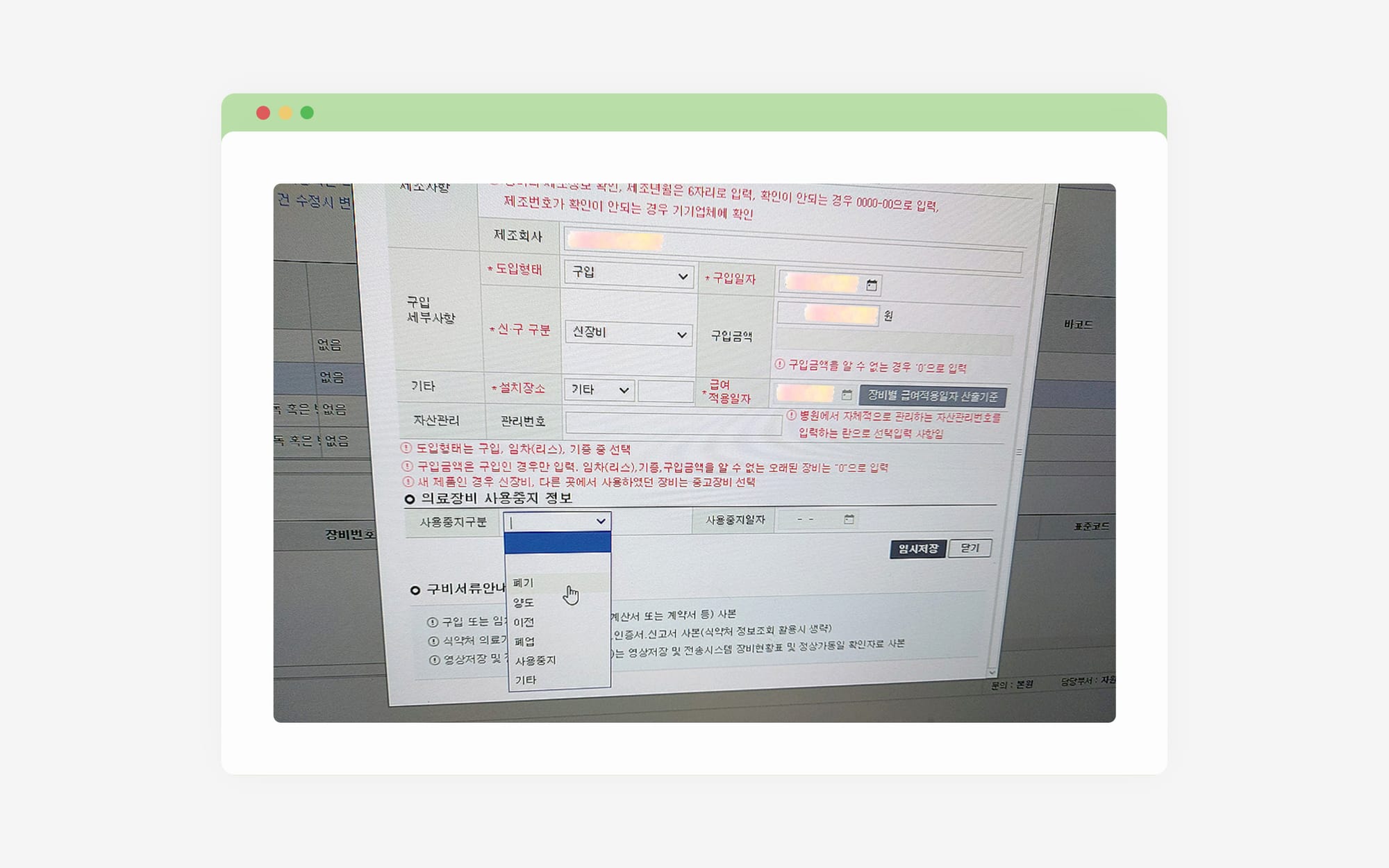 만약 기존에 사용하던 동일 종류의 검사 장비를 교체하는 것이라면, 기존 장비는 ‘사용중지’로 처리해야 해요. 일반적으로 의료 장비 정보 입력창에서 [의료 장비 사용중지 정보] → [사용중지구분] → [폐기]를 선택해 ‘사용중지’로 처리해요.