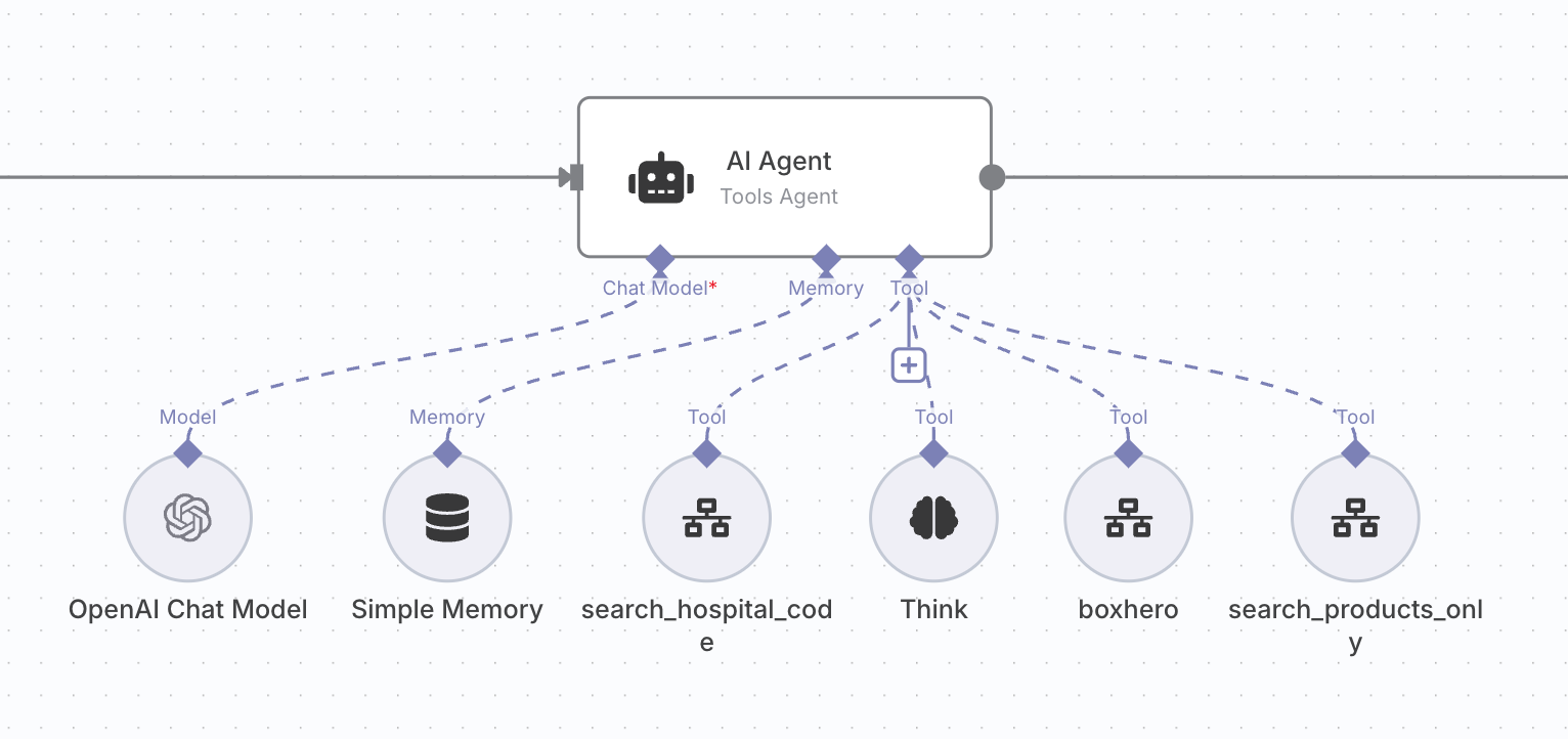 기술팀에서는 기계적으로 수행할 수 있는 작업과 유연한 적용이 필요한 작업을 나누어 챗봇을 만들었어요. 예를 들어, 병원 코드를 찾거나(search_hosptical_code), 제품을 검색하는(search_products_only) Slack 워크플로는 단계에 따라 기계적으로 실행되어 검색 오류를 최소화해요. 그러다 특정 작업이 실행되지 않으면 뇌 역할을 담당하는 AI Agent가 스스로 계획하고 판단하여 상황에 맞게 재실행을 지시하죠.
